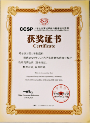 2020 CCF大学生计算机系统与程序设计竞赛(CCSP)于1017日在全国的64CSP认证点高校举办,来自全国67所高校的1016名选手参赛。我校成绩全国排名第十,在工信部七所学校中排名第一。其中张凌源同学获得个人东北区第一,全国第十四的好成绩。