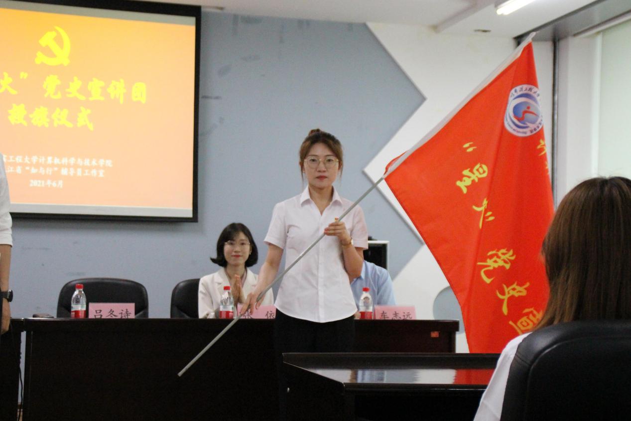 随后,吕冬诗部长向宣讲团授旗,由曾凡一同学代表宣讲团接旗。