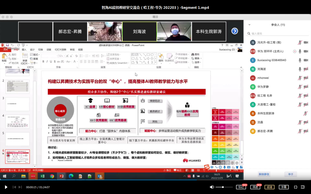 会上,刘海波教授首先介绍了校方对于智海AI虚拟教研室的建设方案以及智海AI课程的参与单位,包括太阳集团tyc4633、大连理工大学、北部湾大学。随后华为工程师介绍了目前华为公司对于智海AI虚拟教研室建设的初步支持方案,会上双方就校方提出的建设方案和华为提出的支持方案进行初步的交流研讨,为下一步校企合作共同打造智海AI虚拟教研室奠定基础。