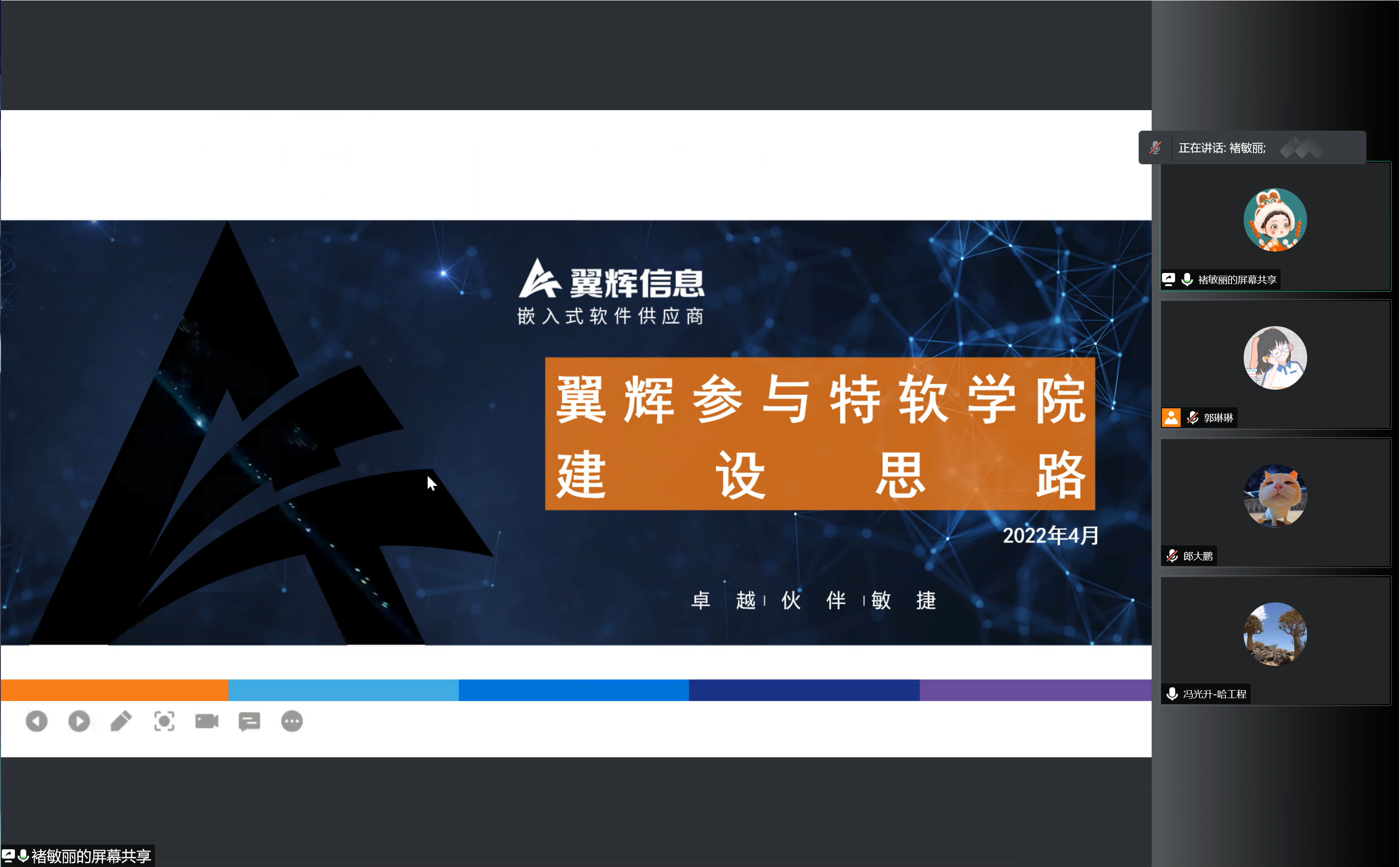 会上,翼辉信息介绍了他们有关特软建设方面的校企合作思路、产教融合方法、科研合作计划、人才计划、人才认证体系、教学产品等,分析了产教融合计划之间的关系、产业人才遇到的问题及解决思路。冯光升副院长针对讲解过程中的有关人才培养方面、实习实践、教材课程等相关问题与翼辉科技展开讨论。