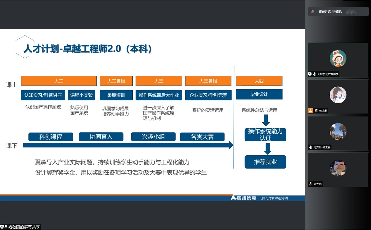 会上,翼辉信息介绍了他们有关特软建设方面的校企合作思路、产教融合方法、科研合作计划、人才计划、人才认证体系、教学产品等,分析了产教融合计划之间的关系、产业人才遇到的问题及解决思路。冯光升副院长针对讲解过程中的有关人才培养方面、实习实践、教材课程等相关问题与翼辉科技展开讨论。