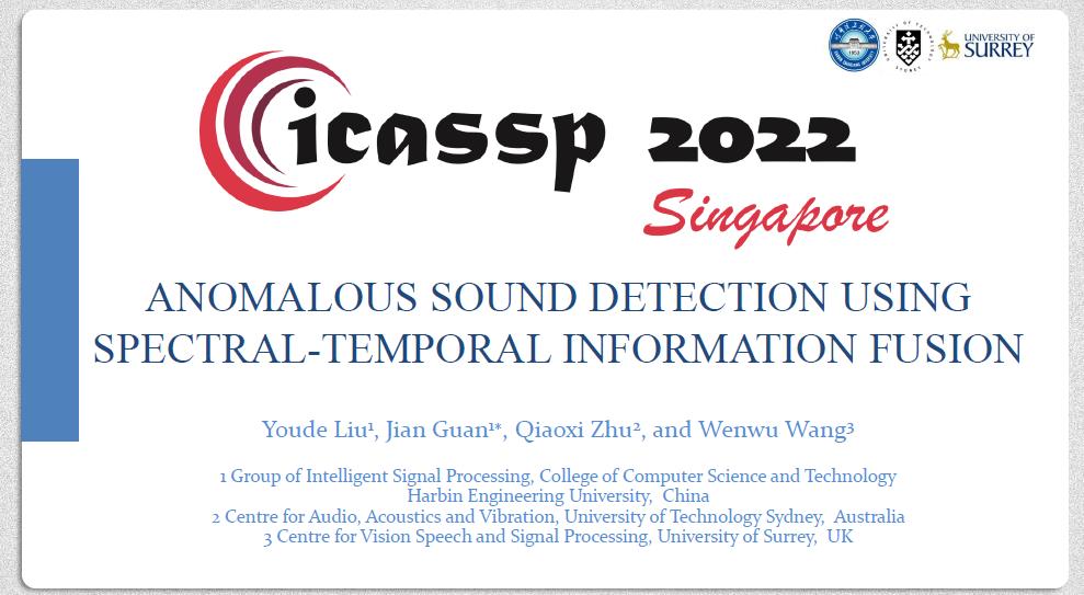 近日,我校太阳集团tyc4633嵌入式与物联网团队智能信号处理组(Group of Intelligent Signal Process, GISP)与悉尼科技大学“音频声学与振动中心”及萨里大学“视觉语音信号处理中心”最新合作研究成果“基于时频信息融合的工业异音检测”(Anomalous Sound Detection using Spectral-Temporal Information Fusion)入选音频信号处理领域顶级国际会议ICASSP 2022。