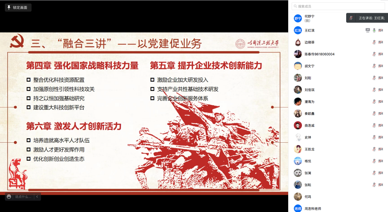 2022年5月10日,602/611/614联合党支部在党支部书记王红滨同志的带领下围绕学习贯彻学校科研工作研讨会《使命引领 战略呼应 科研先行 奋力开创学校高质量发展新局面》报告精神,组织开展了专题研讨。支部成员32人全体参加会议,党支部书记王红滨同志主持会议。