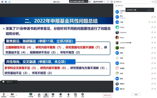 科研副院长王巍对学院近5年国家自然基金情况、2022年基金申报情况、2022年国家自然基金主要改革措施进行了介绍,同时,提出了2023年学院国家自然基金申报目标和工作计划。