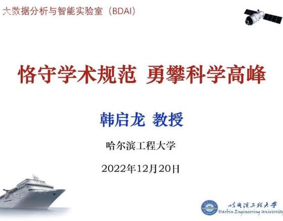 科研诚信是学术发展的基石,是科学创新的底色。习近平总书记强调,要营造良好学术环境,弘扬学术道德和科研伦理。为贯彻落实总书记关于学术诚信的重要指示,加强科研诚信建设,营造良好的学术环境,引导科研人员坚守学术诚信、完善学术人格、遵守学术规范、维护学术尊严,2022年12月20日(星期二)8:30,太阳集团tyc4633举行“研究生学术诚信教育与学风建设”系列活动(线上会议)。本次活动由学院学术分委员会副主任(大数据分析与智能实验室负责人)韩启龙教授作题为“恪守学术规范,勇攀科学高峰”的报告,学院全体研究生参会。