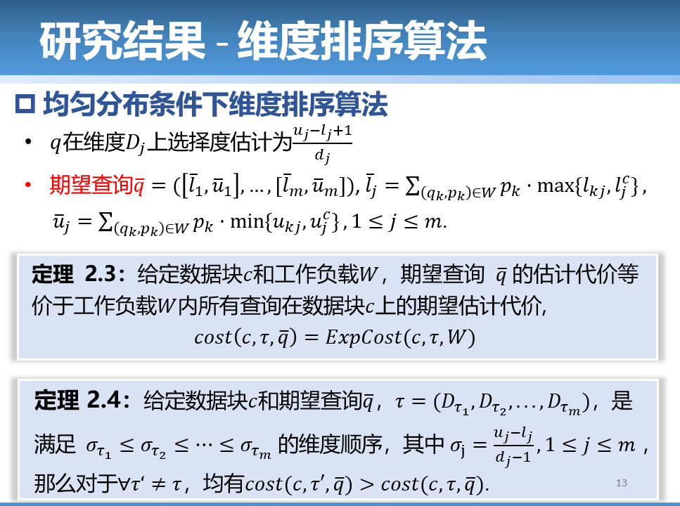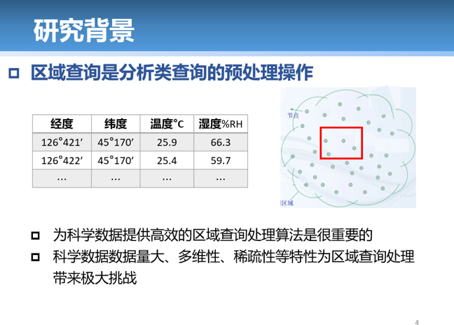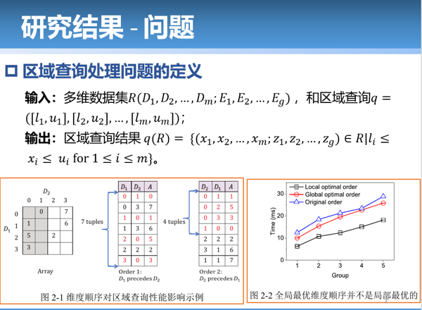 韩帅老师的研究包括区域查询,是科学数据统计分析操作的预处理操作,为了提升区域查询处理性能,提出面向数据块的维度排序问题(CDO问题),利用细粒度的维度顺序优化技术提升查询性能,首先证明了CDO问题是NP难问题,最后提出均匀分布和非均匀分布下的面向数据块的维度排序算法。