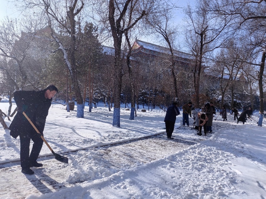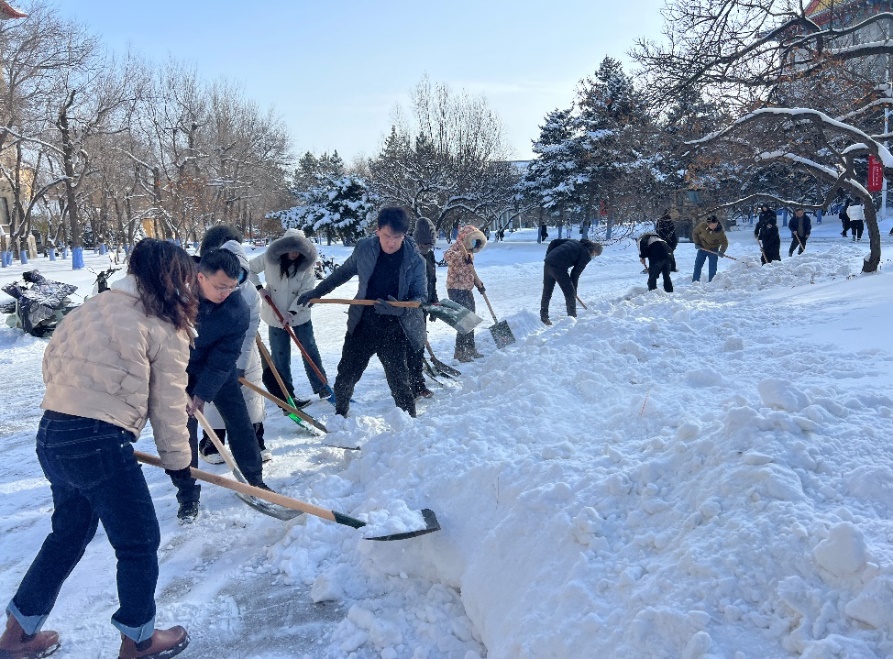清雪过程中,大家挥舞铁锹、不畏严寒、密切配合、齐力协力,清除了21号楼门前厚重的积雪,为师生开辟了一条安全畅通的出行道路,更为这场风雪增添了一抹暖心的风景。