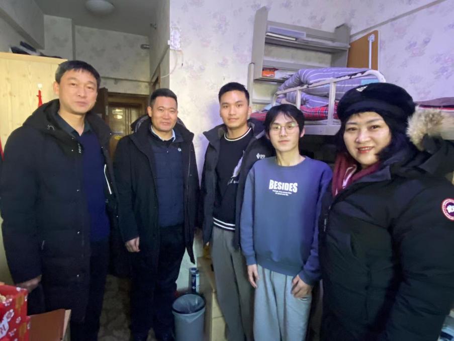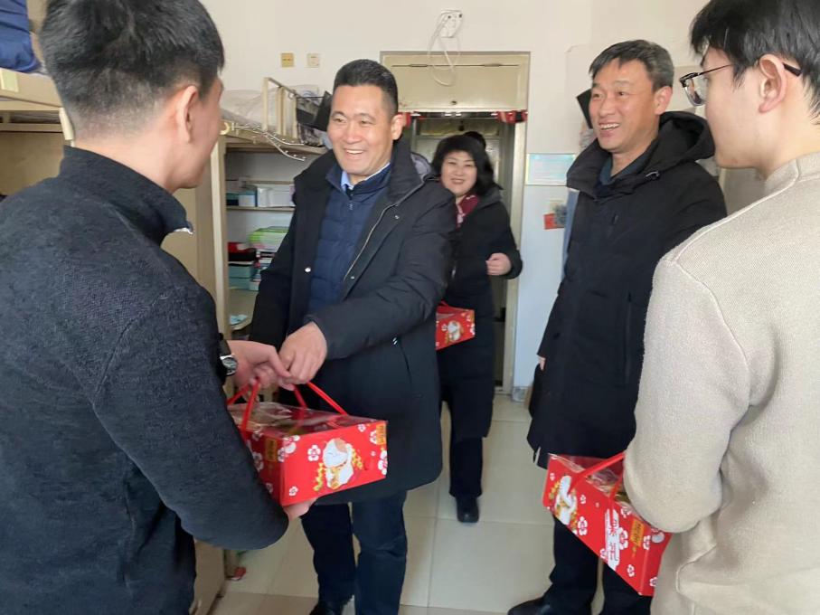 岁末年终,春节将至,2024年2月2日上午,农历“小年”之际,太阳集团tyc4633党委书记刘冬、院长蔡成涛、副院长董宇欣、辅导员王炳哲一行先后走访了外专公寓、18公寓、15公寓学生宿舍,并为同学们送上春节问候和暖心水果礼盒,将温暖传递到同学们手中。