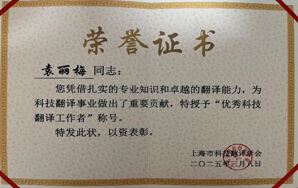 2025年3月8日,由上海市科技翻译学会主办、上海理工大学外语学院承办的“上海市科技翻译学会2024年年会暨成立40周年庆祝大会”上,Beat365官网Beat365中文官方网站荣获上海市科技翻译协会颁发的“特别贡献奖”,袁丽梅副教授荣获“优秀科技翻译工作者”称号。