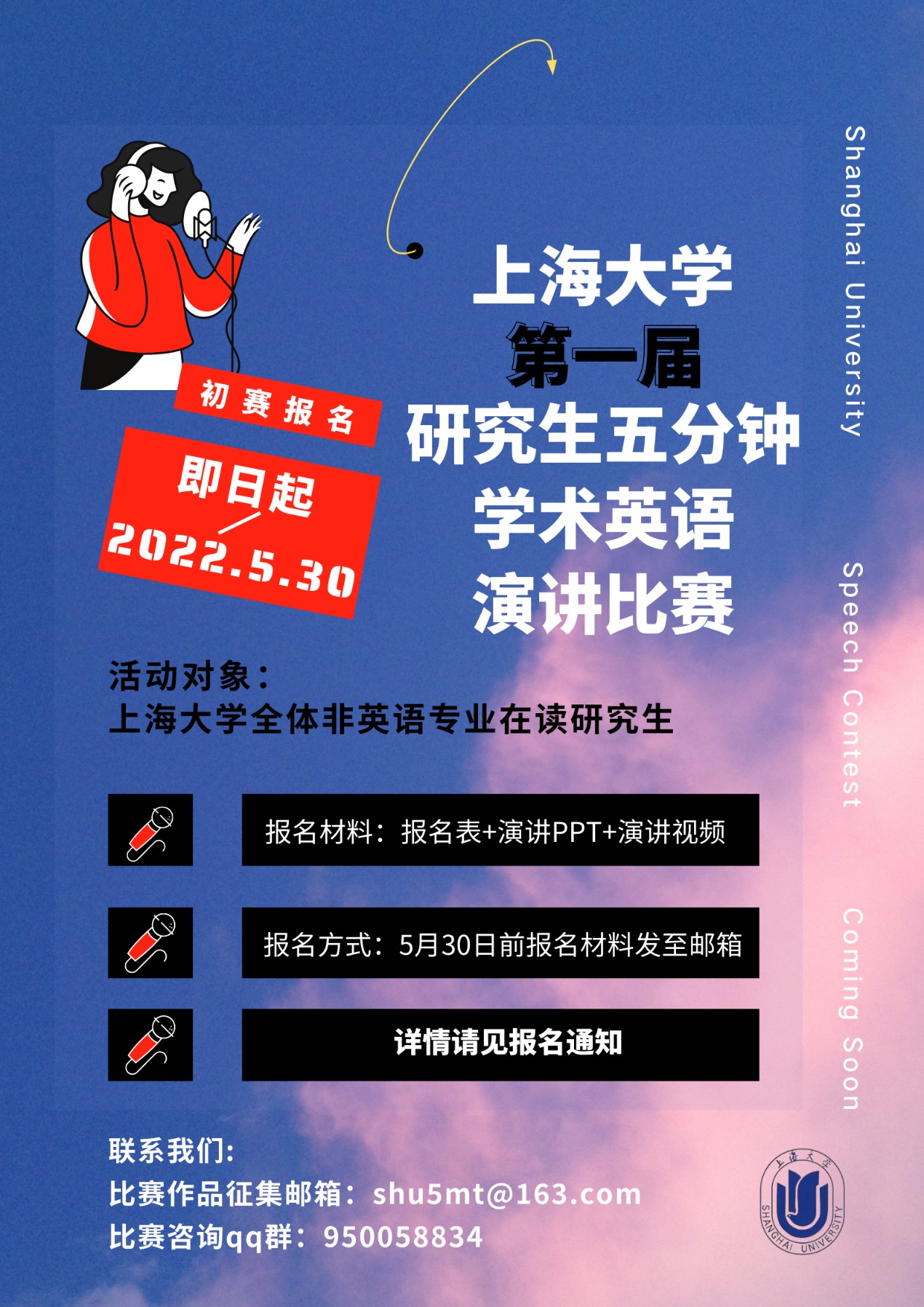 5月30日前发送主题为“学院+姓名+演讲题目”的邮件(附上报名表、演讲PPT和演讲视频)至邮箱shu5mt@163.com
