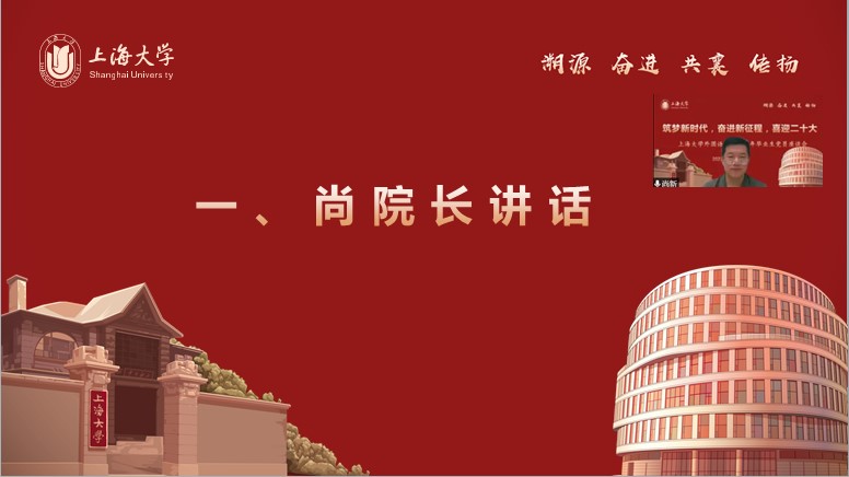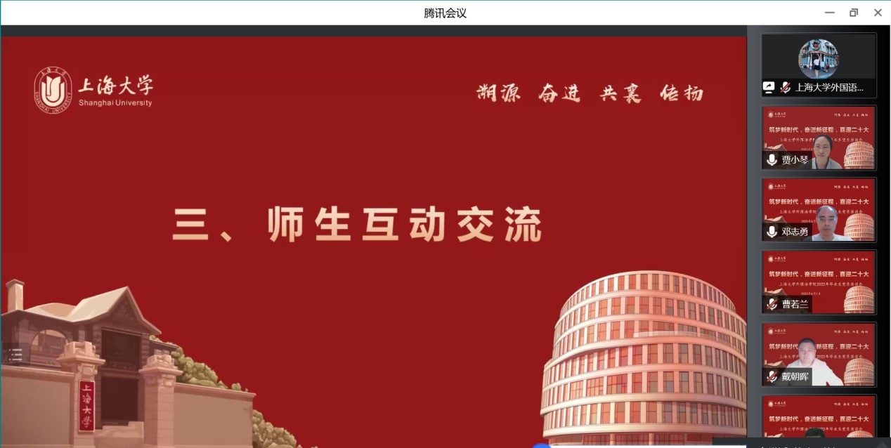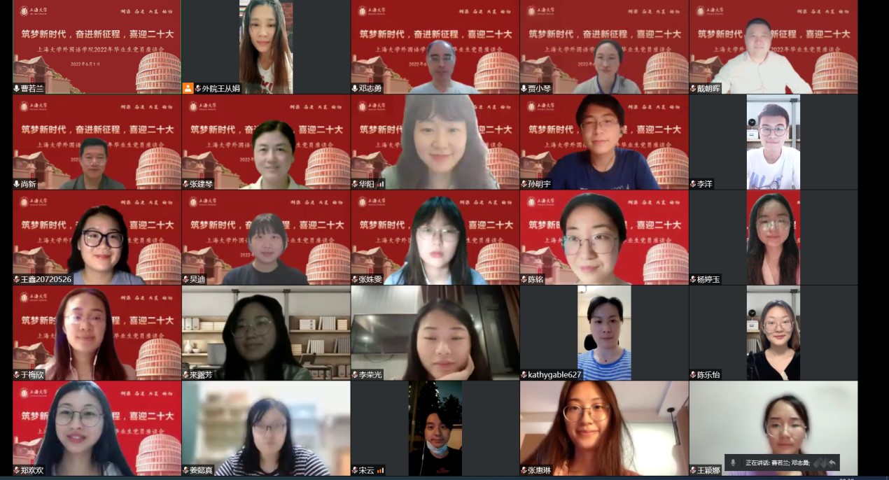 随后,毕业生党员代表们回顾了大学四年学习和成长的历程,表达了对学校和学院的感激之情。2019级学术型研究生党支部组织委员陈乐怡讲到,经过三年的研究生生涯,我们一路求索,在党支部这个集体中一步一步成长;在今后,我们应该做一个有规划、有勇气、努力向前的人,发挥党员的先锋模范作用,牢记上大校训,以严谨的态度和专业的精神辛勤工作,不断向前,为社会做出一份贡献。2020级专业型第一党支部书记严程极表示,支部党员在校期间参加了校运动会、上海电影节、上海自然博物馆等多种志愿者活动,始终践行全心全意为人民服务的宗旨,值得一提的是,本次疫情期间更是积极参与校园防疫,相信未来大家会继续发扬上大的“红色学府”精神。2020级专业型研究生第二党支部书记王鑫表示,今后会始终以优秀党员的标准严格要求自我,努力学习,扎实工作,争取在未来的工作中取得更大的成绩,不辜负母校的培养,不辜负老师的教诲,发扬上大外院“开放包容进取”的精神,做社会的栋梁,为上大外院争光。学生第一党支部书记党员张姝雯讲到,自己和同学们度过了充实的大学校园生活,感恩这四年大学生活给予的锻炼和馈赠,并表明自己今后会在不同的集体里继续发挥党员作用。