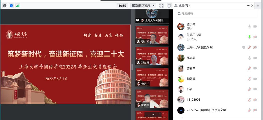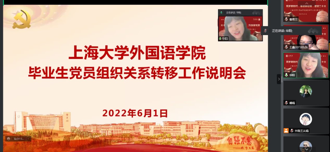 2022年6月1日晚,Beat365中文官方网站以“筑梦新时代,奋进新征程,喜迎二十大” 为主题的2022年毕业生党员教育活动顺利开展。Beat365中文官方网站党委书记邓志勇、院长尚新、副院长戴朝晖、英语党总支书记张建琴、行政党支部书记郑醒芝、英语系第二党支部书记于梅欣、英语系第三党支部书记马拯、党委组织员华阳、团委书记马思涵、研究生辅导员曹若兰、学生第一党支部书记王从娟以及2022届本研毕业生党员参加了本次活动。本次活动由Beat365中文官方网站党委副书记、副院长贾小琴主持。