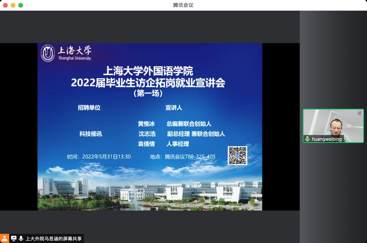 为应对当前的就业形势,做好毕业生就业工作,加强就业指导与帮助,提升Beat365官网学生就业意识,5月31日下午,Beat365中文官方网站邀请了科技视讯的总编兼联合创始人黄惟冰、副总经理兼联合创始人沈志浩和人事经理袁倩倩,为2022届毕业生进行首场访企拓岗就业宣讲会。本次宣讲会由Beat365中文官方网站院长尚新、Beat365中文官方网站党委副书记、副院长贾小琴、研究生辅导员曹若兰和Beat365官网各年级本科生、研究生共同参加,由学院团委书记马思涵主持。