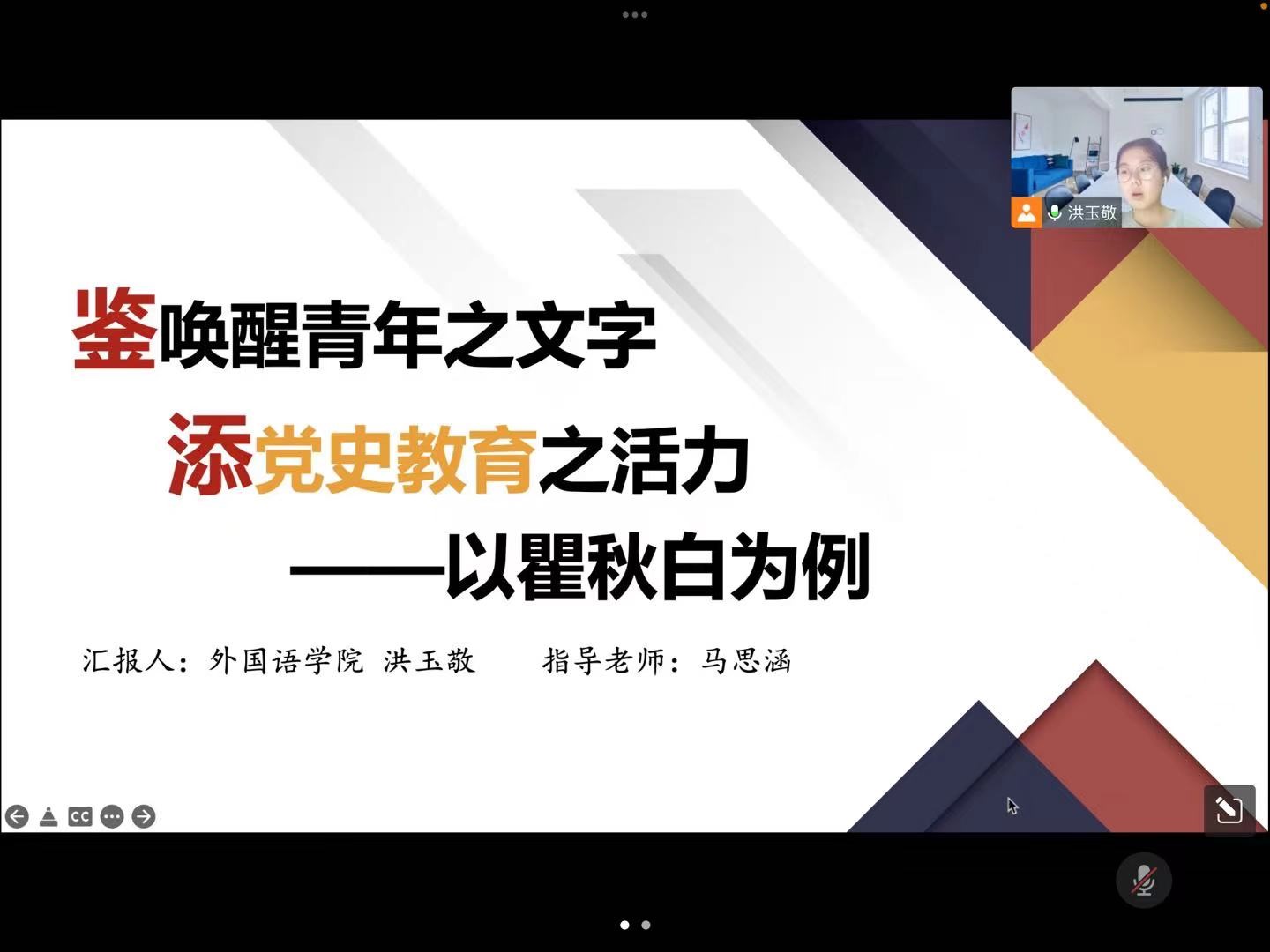 第四组学生代表是洪玉敬同学,主题是”鉴唤醒青年之文字,添党史教育之活力——以瞿秋白为例“,旨在调研当代大学生党史学习教育现状,从而更好的推动深入开展学习。通过实践与调研,展示了瞿秋白先生的革命贡献,结合瞿秋白先生的教育理念提出了大学生开展党史学习教育的优化建议。