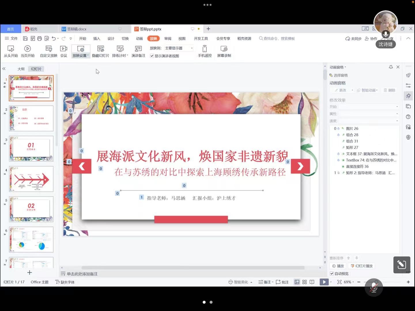 第二组学生代表是沈诗婕同学,主题是“展海派文化新风,焕国家非遗新貌——在与苏绣、蜀绣的对比中探索上海顾绣传承新路径”,旨在通过与苏绣的对比中探索上海顾绣的传承新路径,从选题缘由、实践过程、调研结果和对顾绣传承新路径的思考四个方面展开阐述。调研结果部分分析了顾绣传承面临困境的原因,从而对应衍生出国内赋活传承、加大对外传播。