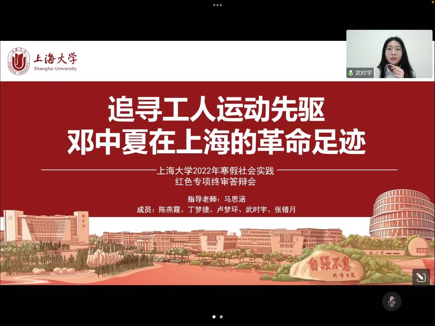 首先,第一组学生代表廖力辉同学带来了以“上大学子何秉彝为例寻觅中国共青团早期斗争史上的上大印记”为主题的项目分享。小组通过腾讯会议等媒介进行了何秉彝先辈的事迹宣讲传播,其后期设想是联合其他红色实践团队及公众号形成系列故事。
