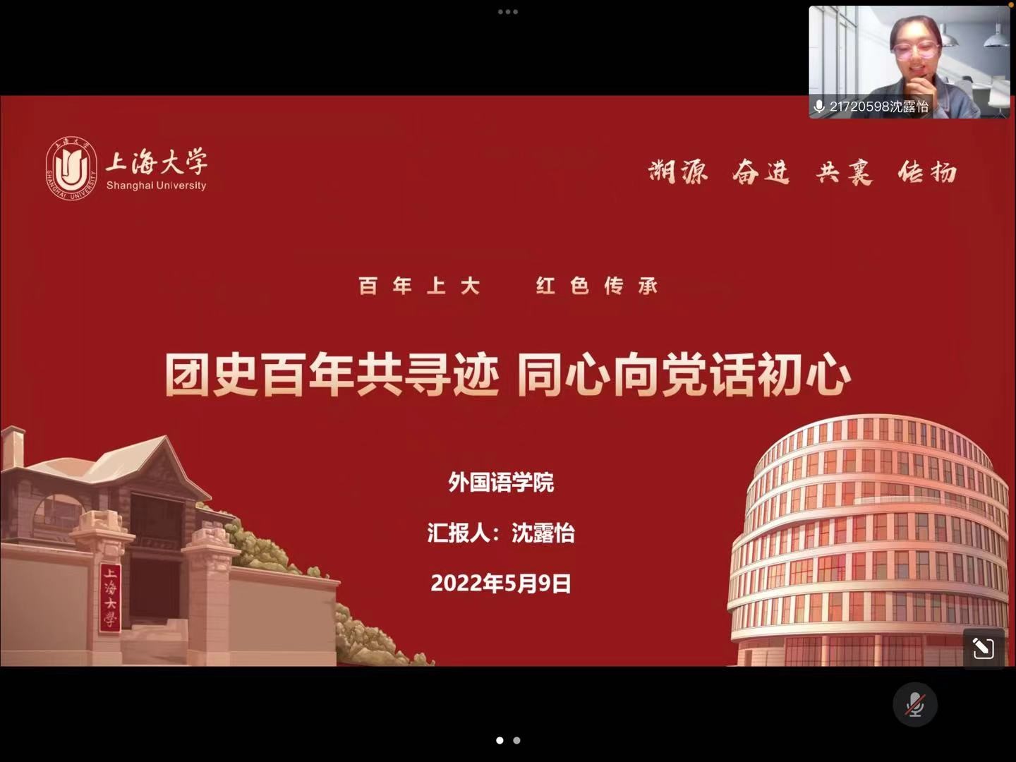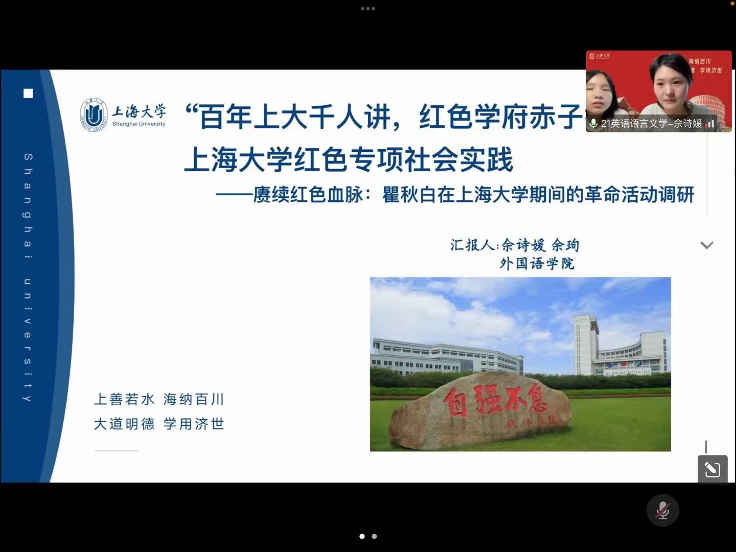 第三组学生代表是任泽萍同学,主题是“追溯建团百年历史,传承上大红色基因:以张秋人为例”,旨在学习革命烈士张秋人的奋斗精神。她从项目概述、实践地点、开展思路、成果展示、感悟等五方面展开讲述,带领大家了解张秋人烈士的革命事迹和奋斗精神,加深了我们对团史校史的理解,呼吁当代青年把红色精神内化为动力,传承弘扬上大人的红色基因。