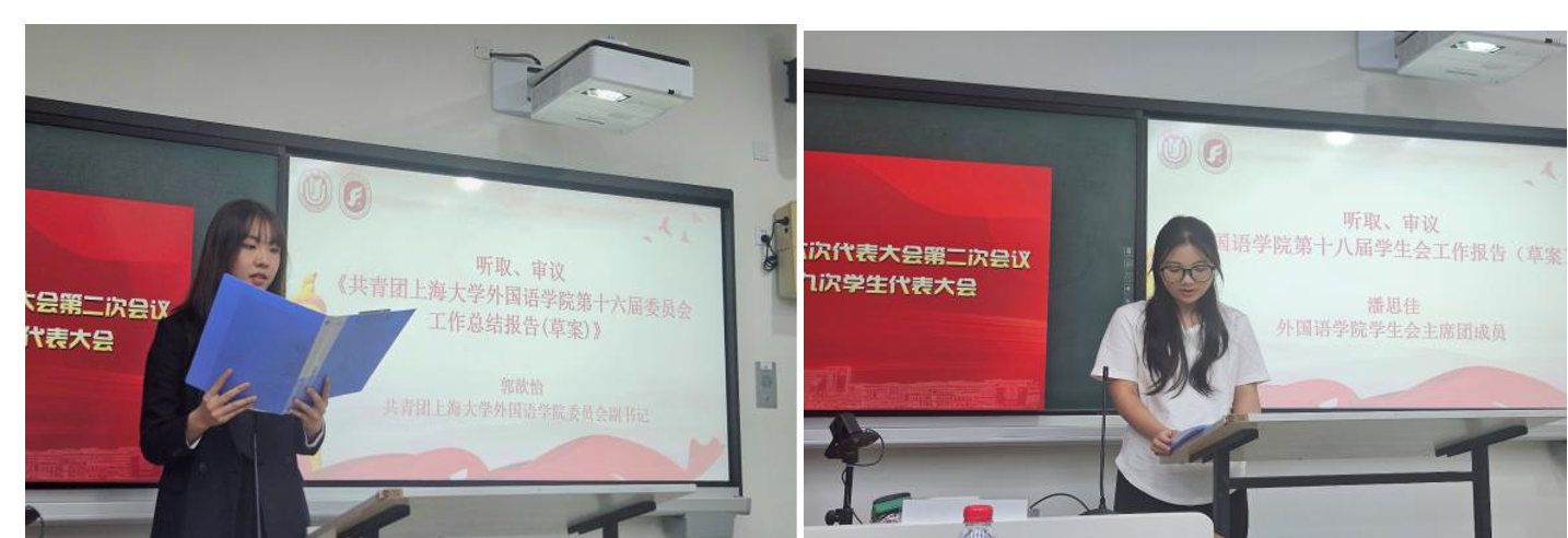 随后,大会先后听取、审议了学院团委副书记郭歆怡同学代表学院团委所作的工作报告(草案)和院学生会主席团成员潘思佳所作的学院第十八届学生会工作报告(草案),对一年的工作进行总结与剖析,并由在场代表表决通过。