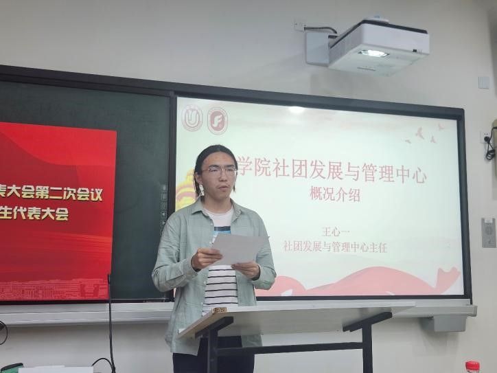 随后,学院第十八届学生会主席团成员李云舒同学宣布成立学院社团发展与管理中心,并由社团发展与管理中心主任王心一进行概况介绍。