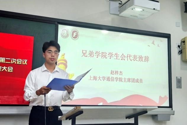 接下来,由通信学院学生会代表赵梓杰同学作致辞,赵梓杰同学表达了两院合作开拓新业务、开创新局面的共同愿望,并预祝本次大会顺利举行。