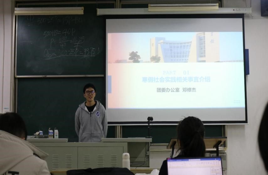 首先,团委办公室邓修杰同学对2024年寒假社会实践相关事宜进行基本介绍,并认为大学生社会实践是一个很好的锻炼平台,实践项目应与时代接轨、结合专业,能够成为今后大家开展创新创业和学术研究的良好基础,呼吁大家积极参加参与。