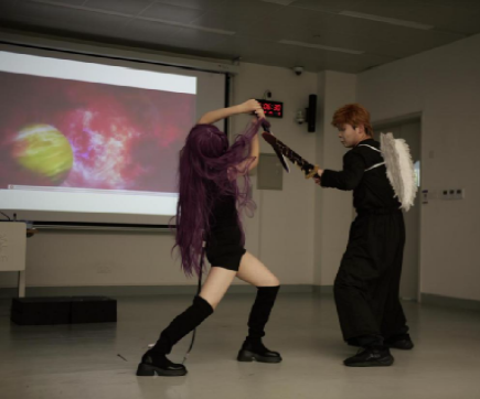 活动重点环节为创意剧本表演。社团成员通过精心编排的剧目,将ACGN经典作品与原创剧情巧妙结合。表演开始前,社团指导老师文雪老师以展演剧目为例给大家介绍了“英雄之旅”戏剧理论,以帮助同学们更好的理解戏剧;表演过程中,演员通过角色转换、台词互动等手法,展现了戏剧与ACGN文化的融合魅力。其中,穿插的舞蹈表演和视频回放环节,更增强了演出的视觉冲击力。