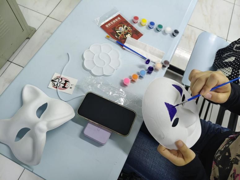 最令人期待的面具DIY环节将活动气氛推向高潮。后勤部为活动准备了画笔、颜料、空白的脸谱与狐面,同学们三两结对,共同创作。画笔挥洒间,既有典雅讲究的京剧脸谱,又有活泼神秘的日式狐面。每个面具都是独一无二的艺术品,共同见证了本次成功的跨文化交流。
