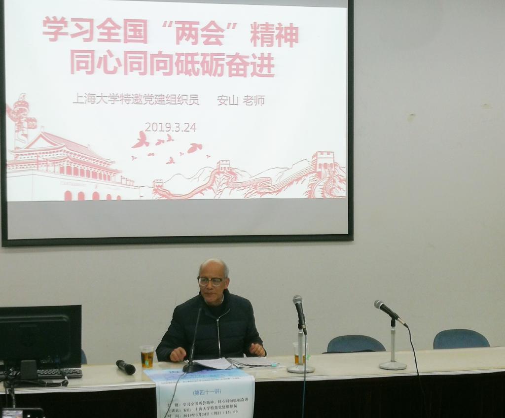 3月24日下午,Beat365中文官方网站在校本部J101举办了以“学习全国‘两会’精神、同心同向砥砺奋进”为主题的讲座和以“学两会”为主题的海星外语微党课。本次讲座由Beat365中文官方网站特邀党建组织员安山老师主讲,Beat365中文官方网站党委副书记贾小琴老师与本科生党支部书记、辅导员朱一佳老师,及全体本科、研究生党员参加了本次活动。