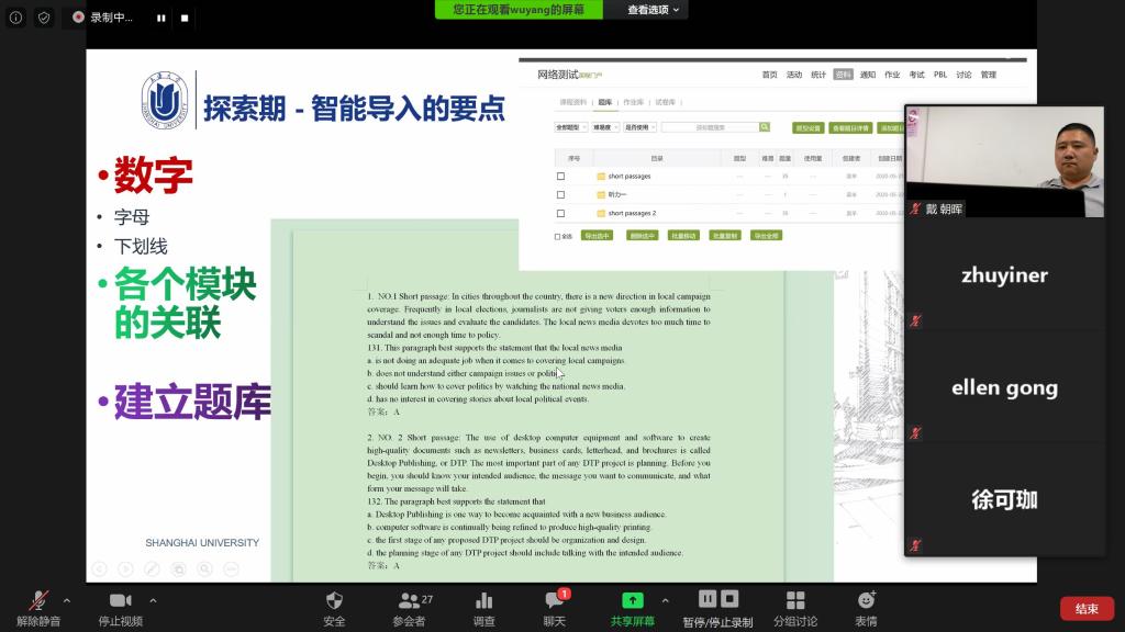 首先,贾老师给大家做了动员讲话,希望老师们在命题时考虑学生们特殊时期身边没有教材等实际困难,在线答疑时注意缓解学生压力。戴老师接下来详细解读了《Beat365中文官方网站2019-2020冬季学期在线考试须知》,从考试安排、考前准备、考试中的各种操作细则等方面进行了全方位细致的说明。随后,英语系吴羊老师分享了超星平台考试的操作经验,从试题导入到考前设置,给予了众多实用的小贴士。最后,与会教师就线上考试的各种问题进行了研讨,包括登录名的设置、摄像头的摆放、超星平台的考试时间设置、试卷的提交等。与会老师提出问题,并通过交流相互解答,解决疑问效果良好。