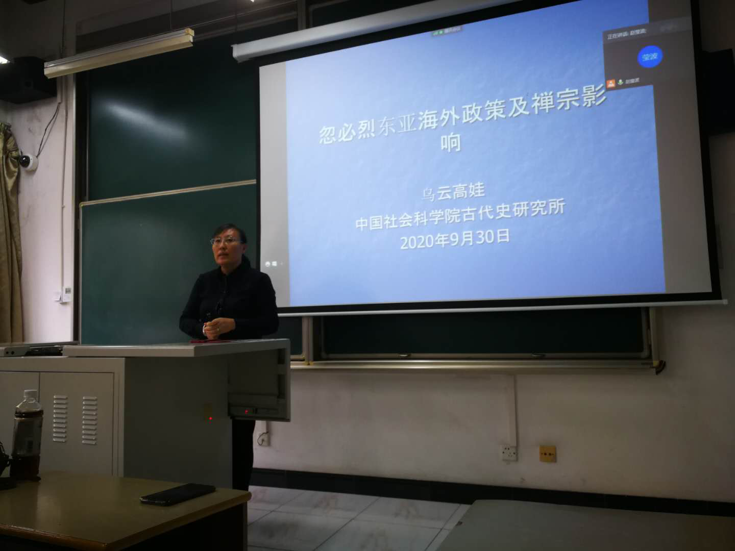 首先,乌云高娃研究员为大家做第一场讲座。乌云高娃研究员通过丰富的史料和图片,从忽必烈对高丽的怀柔、元朝与高丽的政治联姻、忽必烈诏谕日本及两次征日本、成宗再派使臣诏谕日本及禅宗影响四个方面为大家详细地介绍了忽必烈东亚海外政策以及禅宗的影响。乌云高娃研究员最后总结,13、14世纪东亚的禅宗文化交流达到了鼎盛时期。元代的游牧文化、江南文化,从不同层面、不同渠道传播到东亚。尤其是江南文化传播到高丽、日本,对东亚蒙古、高丽、日本的文化交流、文化发展产生了很大影响。