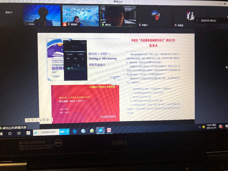 紧接着虞怡达老师以大学跨文化综合教程为例,分享了思政融入方案,从语言能力、跨文化交际能力、以及德育教育三个方面,探讨如何通过开展对照、探索、反思和创造的等活动,使学生逐渐了解多样性的意义,培养爱国、敬业、友爱的社会主义核心价值观。