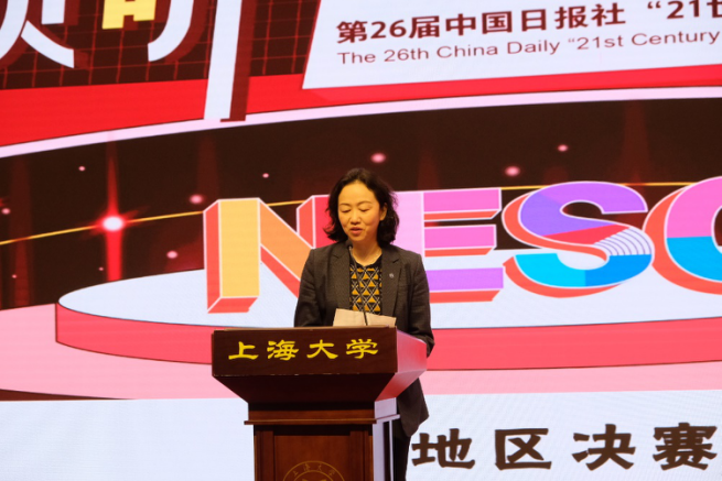 4月24日上午,第26届中国日报社“21世纪·可口可乐杯”全国大学生英语演讲比赛上海地区决赛在Beat365中文官方网站图书馆报告厅顺利举行。Beat365中文官方网站党委副书记、副校长龚思怡出席开幕式并用英语致开幕词。