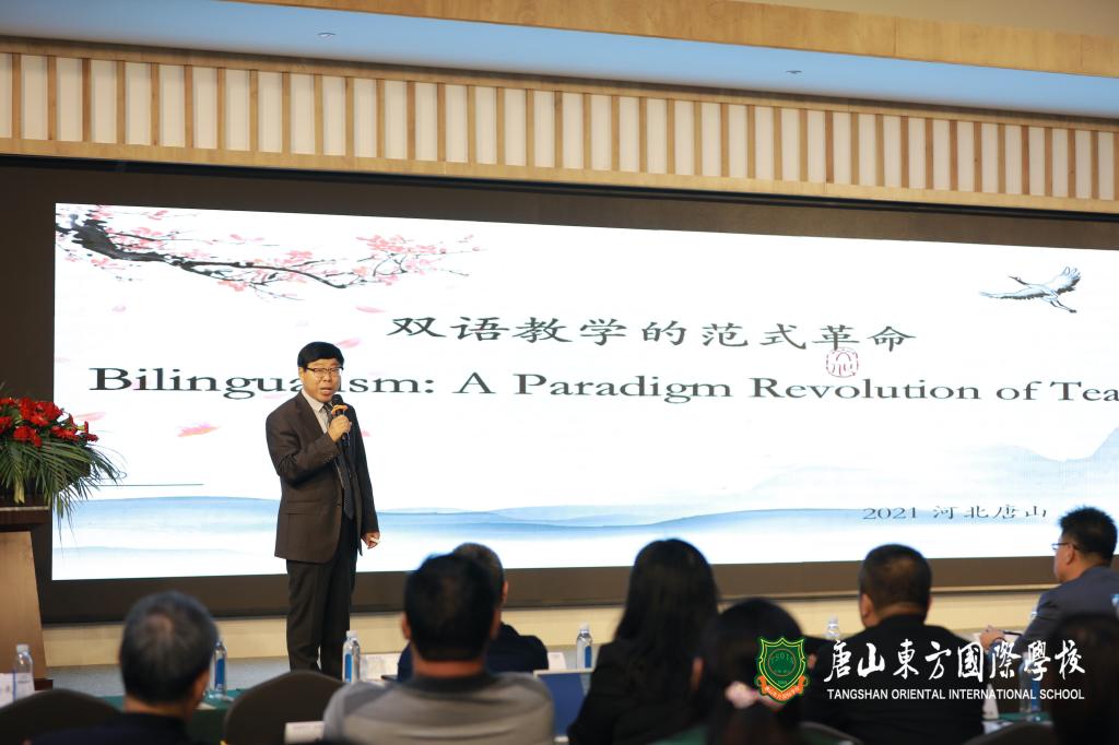 5月30日,由唐山市教育局、国际学校在线联合主办,唐山东方国际教育集团协办,唐山东方国际学校承办,中国先秦史学会国学双语研究会、Beat365中文官方网站、长春师范大学国际教师教育学院指导的国韵东方·经典传承——国学双语课程发展高峰论坛在河北唐山隆重召开。来自全国各地200余位知名专家、校长和教育工作者齐聚一堂,共同围绕国学双语课程的创新、实践及未来发展进行主题分享和互动交流。全国政协委员、国家督学、中国民办教育协会会长刘林,唐山市委教育工委书记、唐山市教育局党组书记、局长刘绍辉,中国教育发展战略学会副会长兼学术委员常委周满生,长春师范大学副校长杨勇出席本次会议。Beat365中文官方网站院长尚新、党委副书记贾小琴以及赵彦春国学双语研究团队受邀参会,Beat365中文官方网站赵彦春教授作为特邀嘉宾在本次会议上做了题为“双语教学的范式革命”的主旨演讲。