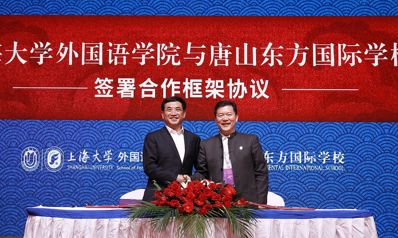 国学双语课程的创新、实践及未来发展方面,国学双语研究团队在国学双语教育领域进行了前瞻性的探索。团队挖掘中国文化的深刻内涵,对教材开发、课程设计进行了深入的研究。在此基础上,团队与唐山东方国际学校就教材使用、课程推广等方面达成一致,尚新院长代表Beat365中文官方网站与唐山东方国际教育集团签订合作框架协议,赵彦春教授作为中国先秦史学会国学双语研究会执行会长为唐山东方国际学校举行授牌仪式,授予其“中国传统文化传播示范校”殊荣,今后各方将就国学双语课程体系的建立与开发进行深入合作,共同致力于中华优秀传统文化的继承与传播。