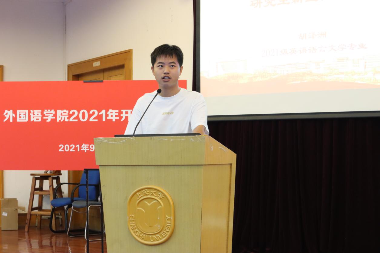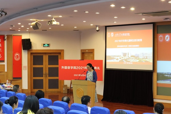 典礼在全体师生齐唱国歌后拉开序幕。尚新院长首先代表学院向2021级全体新生表示热烈欢迎,并发表“回顾历史,彰显精神,立志报国,自强不息”主旨演讲,分享了上大和学院的历史沿革,以及上海和上大的精神。院长深情讲述Beat365中文官方网站作为红色学府的独特历史和知名校友在上大的故事,带领新生一起了解上大外院的前身——1923年成立的英国文学系;精彩的演讲让新生们真切感受到上海城市“海纳百川、追求卓越、开明睿智、大气谦和”的精神和Beat365中文官方网站开放包容、追求卓越的校园氛围。院长祝福所有新生:“愿各位同学求学上大,人人能青春无悔,成为强国有我的栋梁之才。”