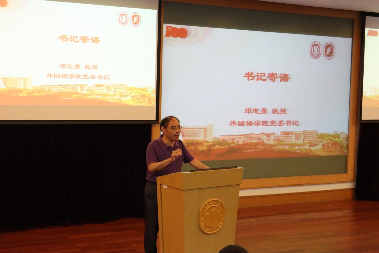 最后,党委书记邓志勇教授寄语新生,并鼓励新同学们:作为外院学子,应具备家国情怀、国际视野,培养过硬的专业本领,在建党百年之际,向党靠拢,听党话跟党走。