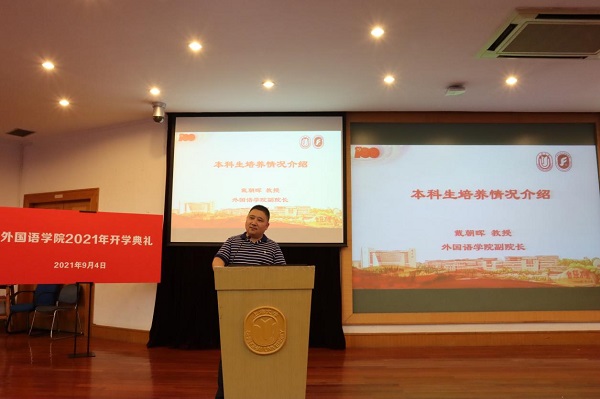 9月4日13:00,Beat365中文官方网站2021年开学典礼在校本部J202如期举行。Beat365中文官方网站党委书记邓志勇教授、院长尚新教授、党委副书记贾小琴老师、副院长戴朝晖副教授、唐青叶教授、英语系主任张新玲教授、日语系主任赵莹波教授、英语系导师代表王骞老师、日语系导师代表文雪老师、张晓娜老师、本科生辅导员梁苗老师、研究生辅导员马思涵老师和曹若兰老师以及2021级全体新生共同参加了本次开学典礼。本次典礼由学院党委副书记贾小琴老师主持。
