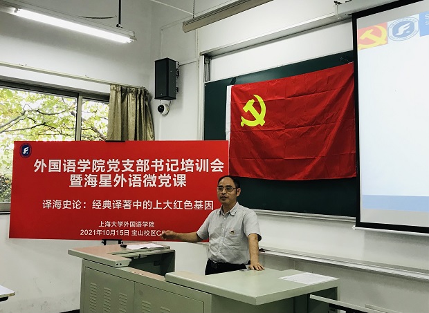 党支部书记培训会结束后,开展了以“译海史论:经典译著中的上大红色基因”为主题的海星外语微党课。首先,英语系教工第一党支部书记袁丽梅分享了题为《李季,红色翻译家》的党课,用英语介绍了翻译家李季为党所作的贡献。建党初期,李季埋头翻译海外社会主义思潮论著,翻译了大量马克思主义理论著作,有力促进了马克思主义在中国的传播和推广。接下来,日语系教工党支部廖瑞平分享了《我和电视纪录片<大上海计划>》的党课,廖老师分享了自己参与电视纪录片《大上海计划》日语翻译工作的心得体会,并讲解了淞沪会战的事迹,希望各位党员用好上海的红色资源,开展党史学习教育,从党的辉煌历史中汲取奋进力量。随后,2020级学术型研究生党支部书记金滢洁分享了题为《豪情满怀革命路,坚贞不屈永流芳》的党课,她用日语介绍了无产阶级革命家恽代英的翻译生涯。恽代英从学生时代就积极参加革命活动,由他创办和主编的《中国青年》影响了整整一代青年。最后,2020级专业型研究生第一党支部书记严程极为大家带来《译生为党,惊世太雷—张太雷》为题的党课,介绍了张太雷用自己短短29年的生命历程践行了“愿化作震碎旧世界惊雷”的铮铮誓言。