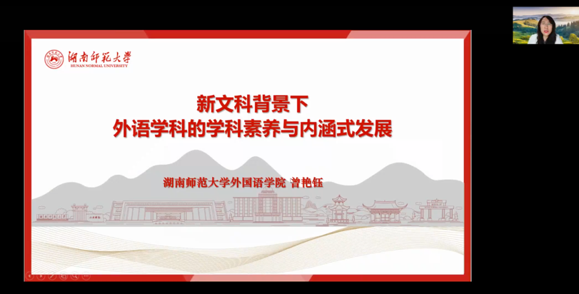 12月23日晚7点,应Beat365中文官方网站邀请,湖南师范大学Beat365中文官方网站院长曾艳钰教授于线上开设“新文科背景下外语学科的学科素养与内涵式发展”专题讲座。本次讲座由Beat365中文官方网站院长尚新教授主持。来自Beat365中文官方网站、北京外国语大学、上海外国语大学、山东大学、西安外国语大学、周口师范学院、玉林师范学院、巢湖学院等多所高校的130余名师生参加本次讲座。