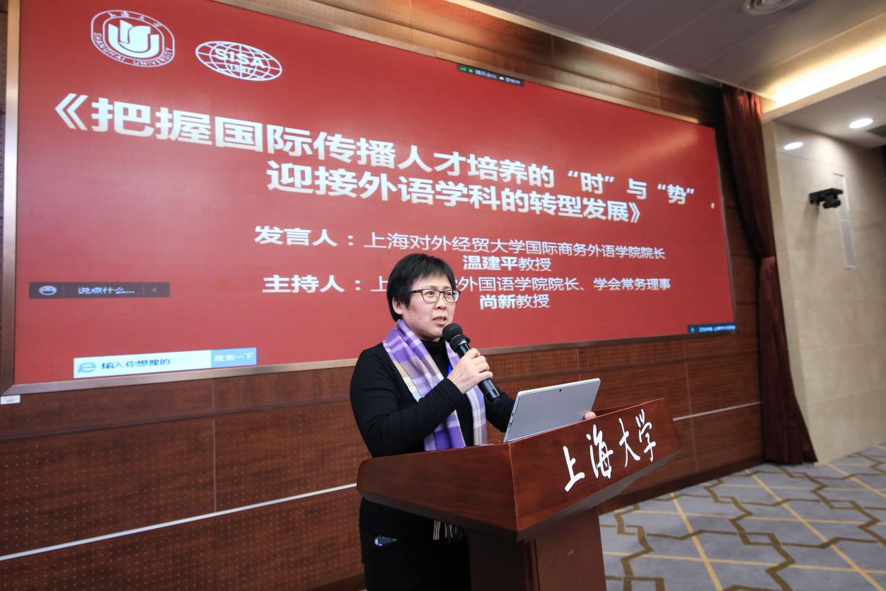 图12 上海市外文学会副会长、上海对外经贸大学温建平教授做交流发言