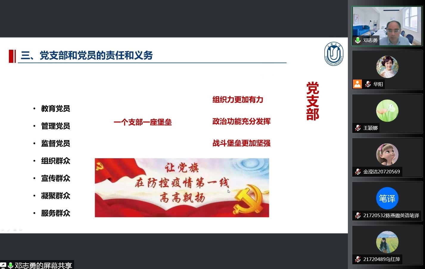 4月7日中午12点,Beat365中文官方网站党委以线上会议方式召开疫情防控专题组织生活会工作部署会,传达党中央、上海市疫情防控有关精神和要求,对下一步疫情防控工作再动员、再部署、再落实。学院党委书记邓志勇,党委副书记、副院长贾小琴,党委委员、英语党总支书记张建琴及全体党支部书记参会。