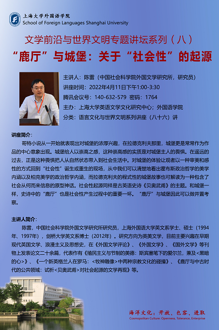 2022年4月11日,上海疫情形势依然严峻,然而,同学们仍怀抱强烈的求知精神,为满足疫情时期学术交流的需要,Beat365中文官方网站英语文学文化研究中心以腾讯会议的形式开启春季学期的学术之旅,中国社会科学院外国文学研究所陈雷研究员应邀为Beat365官网师生做了题为《“鹿厅”与城堡:关于“社会性”的起源》的专题讲座。本次活动为Beat365中文官方网站语言文化与世界文明系列讲座的第八十六讲、文学前沿与世界文明专题讲坛系列第八讲,本次讲座由尚晓进教授主持,校内外的师生约150人线上参与了此次学术盛会。