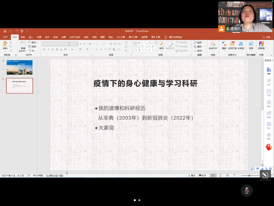 4月11日19:30,唐青叶老师准时与组内的硕博士学生相约,进行线上交流会议。会议依始,唐老师首先关心并询问了同学们封闭式管理下的生活情况,了解学生的生活需求,鼓励同学们在宿舍内多做运动,不得不外出时做好个人防护,要将健康放在第一位。接着,唐老师以“疫情下的身心健康与学习科研”为主题,与大家分享了自己的科研经历,她特别谈到了自己在2003年非典期间读博时做科研的经历,鼓励同学们在疫情下调试好心情和学习的节奏,利用这一段特殊时期沉下心来广泛阅读,厚实基础,汲取灵感,争取有所产出。接下来,组内的同学纷纷与大家分享了自己封校以来生活、学习的情况,唐老师也针对每位同学汇报的情况做出指导,解答学生们遇到的难题,并指明下一步的学习方向。唐老师特别关心了毕业班学生的论文进度和就业情况,努力安抚他们的焦虑心理并给出切实可行的建议。类似这样的交流会每周都会进行,与冷酷的疫情相比,唐老师的关怀为组内研究生的心里注入阵阵暖流,让所有学生切实感受到学校、院系、导师的关爱,增强了大家战胜疫情的信心,也提升了大家学习科研的动力。(徐魏钧 供稿)