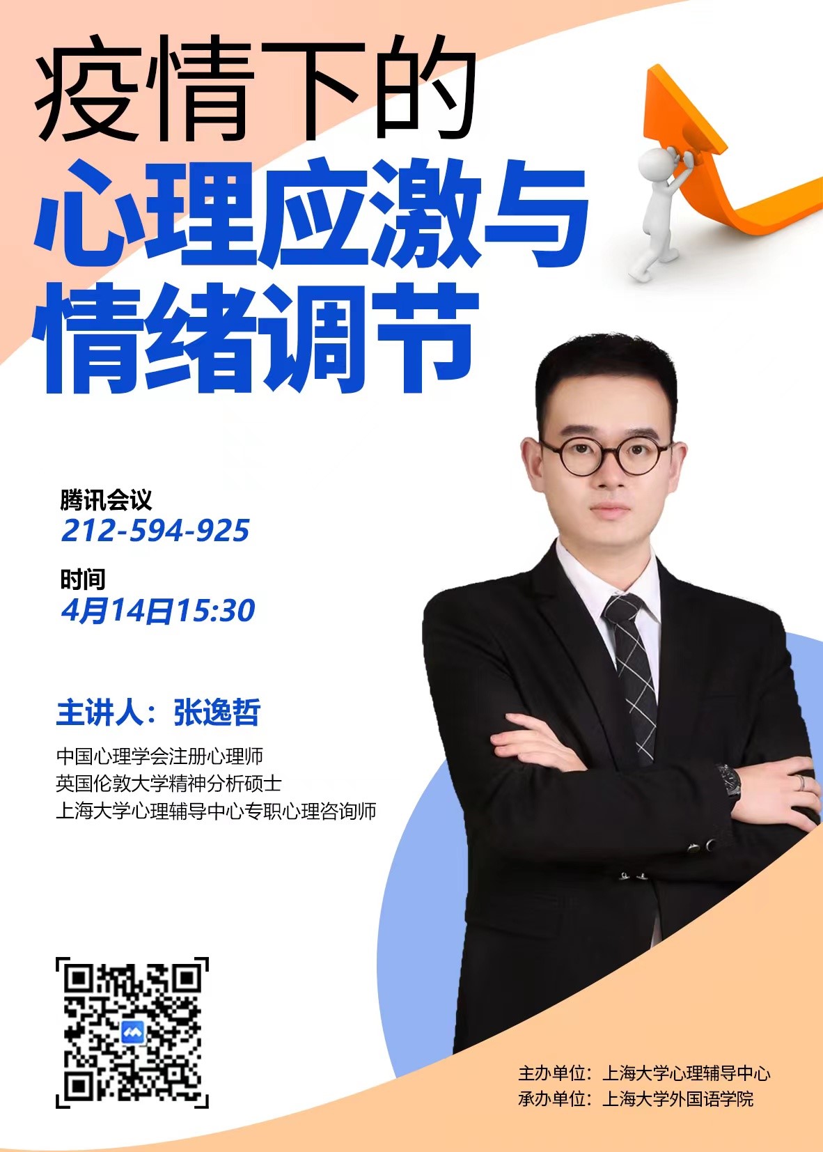 近期,上海疫情防控总体形势仍然十分严峻,Beat365官网目前处于封闭管理的特殊时期,学院师生积极参与疫情防范工作中,他们的身影既在志愿服务前线,也在守护后方平安。为帮护广大同学们在特殊时期下保持良好心理状态,由Beat365中文官方网站心理辅导中心主办、Beat365中文官方网站承办的“疫情下的心理应激与情绪调节”主题讲座于2022年4月14日下午在云端正式开讲。中国心理学会注册心理师、Beat365中文官方网站心理辅导中心专职心理咨询师张逸哲老师给大家带来了丰富详实、细致暖心的讲座内容,为外院同学们解疑答惑、提供专业而温暖的心理援助。