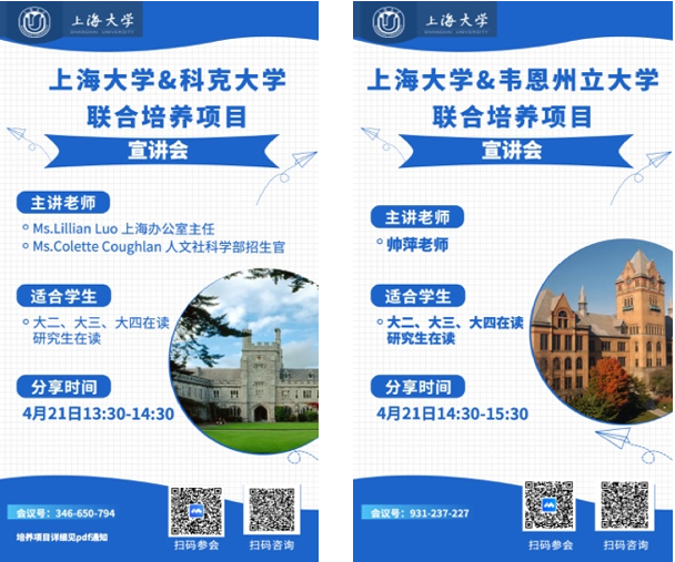 Beat365中文官方网站为进一步促进学院的国际化工作开展,帮助学生拓展自己的的国际化视野,于4月21日13:30-14:30及14:30-15:30分别举办了Beat365中文官方网站与科克大学联合培养项目及韦恩州立大学联合培养项目宣讲会。会议邀请到科克大学上海办公室主任Ms. Lillian Luo 、人文社科学部招生官Ms. Colette Coughlan及Beat365中文官方网站帅萍老师与同学们进行了亲切的交流与互动。Beat365中文官方网站尚新院长与分管国际事务的戴朝晖副院长参与并主持了本次宣讲会。