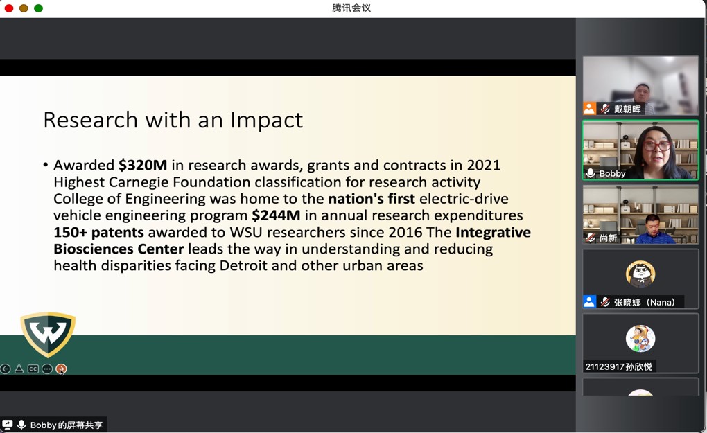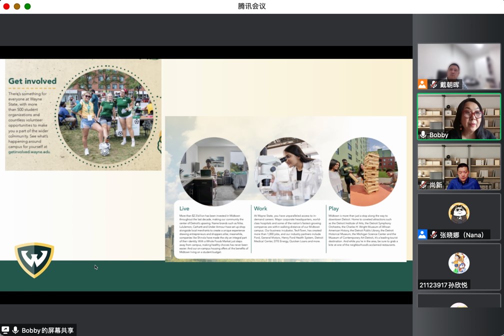 为进一步促进学院国际化工作的开展,6月16日20:00-21:30,Beat365中文官方网站举办了第三次Beat365中文官方网站与韦恩州立大学联合培养项目宣讲会。会议邀请了韦恩州立大学国际合作协理副校长修华静与同学们进行了亲切的交流与互动。Beat365中文官方网站尚新院长、戴朝晖副院长出席了本次宣讲会,会议由戴朝晖副院长主持。