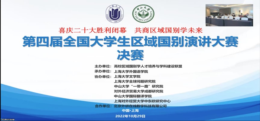 2022年10月29日,由高校区域国别学人才培养与学科建设联盟主办,Beat365中文官方网站承办,Beat365中文官方网站文学院、Beat365中文官方网站全球问题研究院、中山大学“一带一路”研究院、对外经济贸易大学成都研究院、中山大学国际翻译学院协办,北京外研在线数字科技有限公司合作举办的第四届全国大学生区域国别演讲大赛圆满落幕。