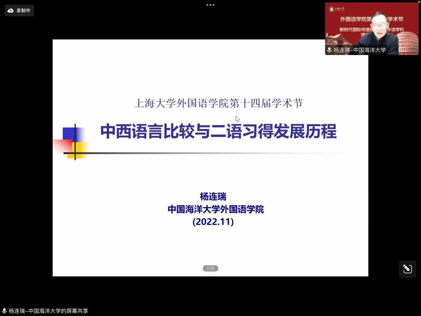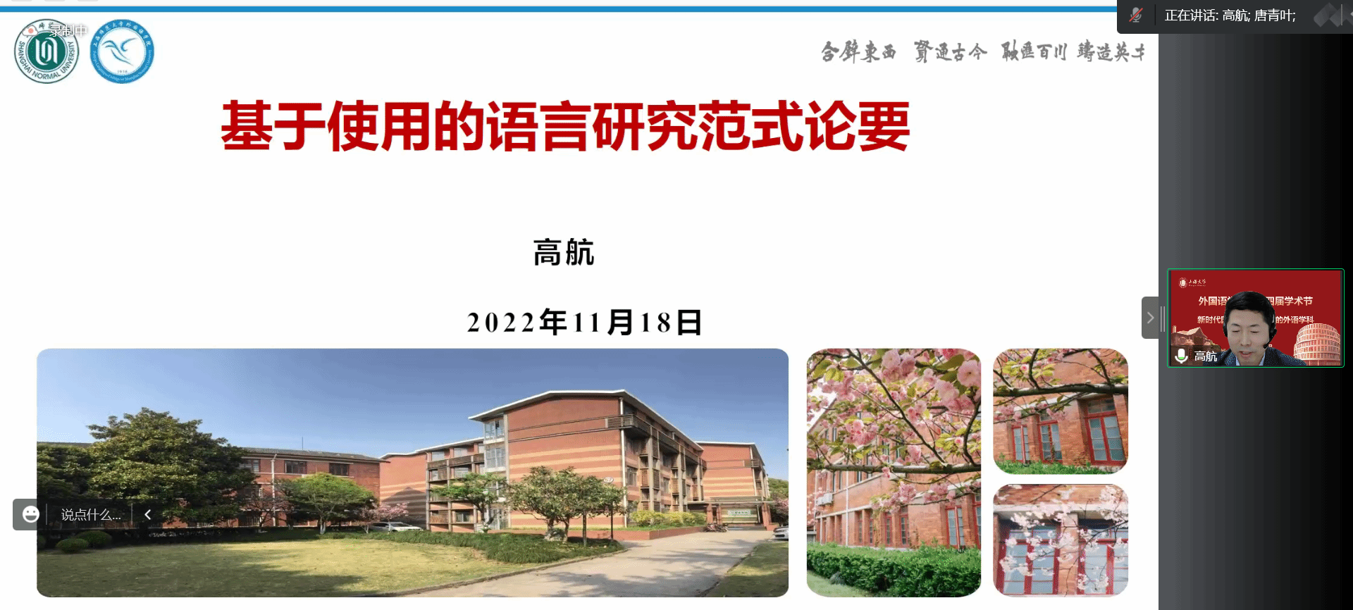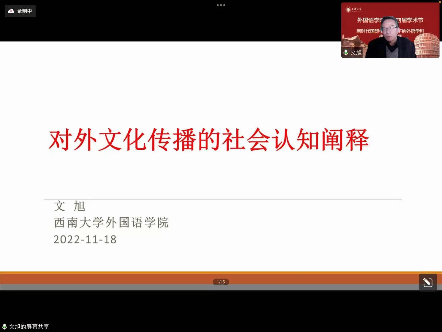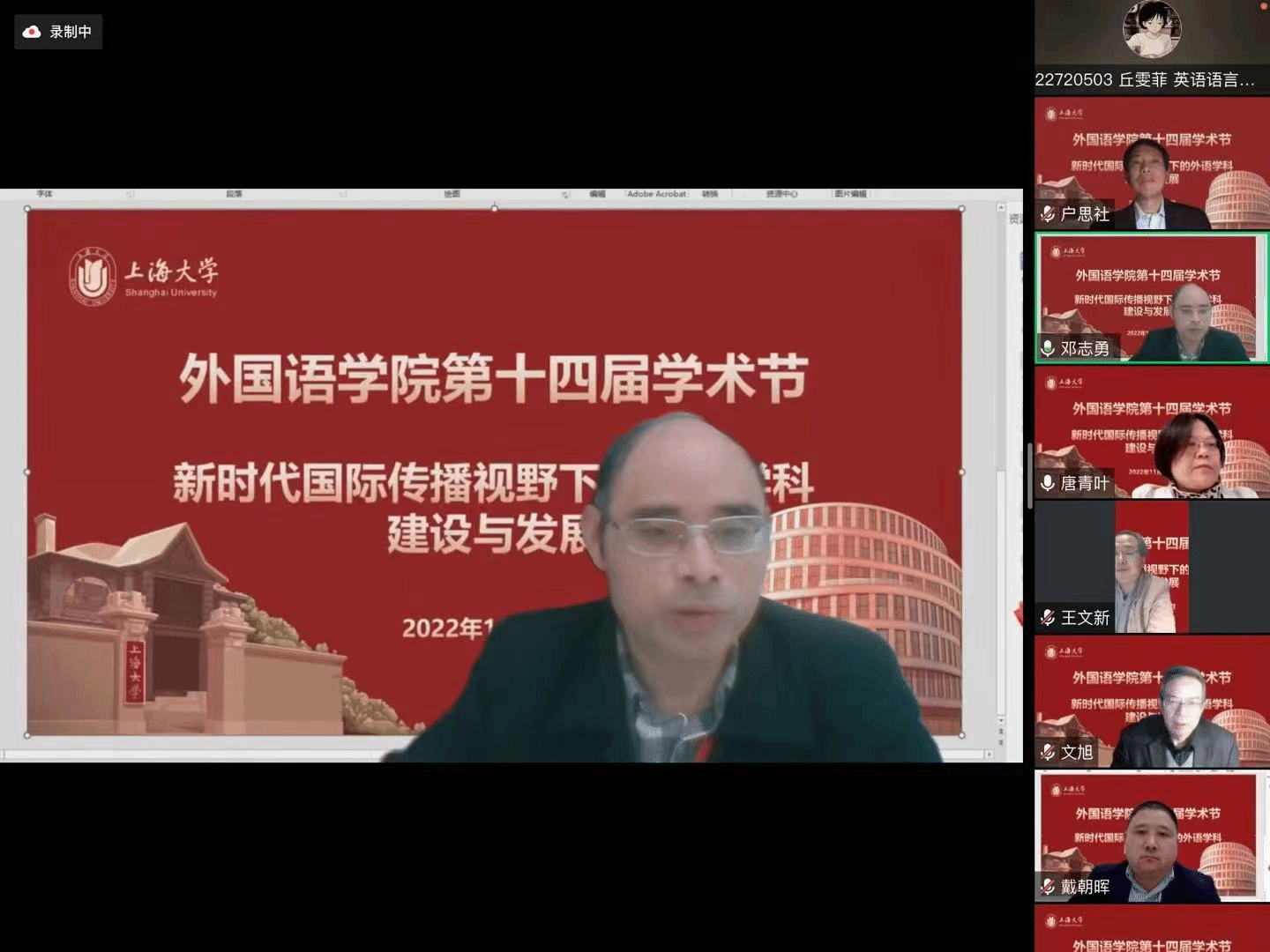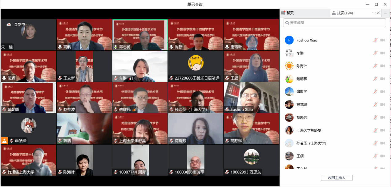 在喜庆党的二十大胜利召开、Beat365中文官方网站建校100周年,以及对接“中华文化走出去”“讲好中国故事”的国家战略需求背景下,Beat365中文官方网站积极作为,竭力为国家战略发展、上海市城市软实力提升和以上海为核心的长三角协同融合做贡献,举办以“新时代国际传播视野下的外语学科建设与发展”为主题的系列学术活动暨Beat365中文官方网站第十四届学术节。11月18日下午以线上形式举行学术节开幕式,主题为“新时代国际传播视野下的中西语言文化比较研究”。本次开幕式有六位专家做主旨报告,Beat365中文官方网站副院长唐青叶和戴朝晖担任主持,约200名校内外师生参加。