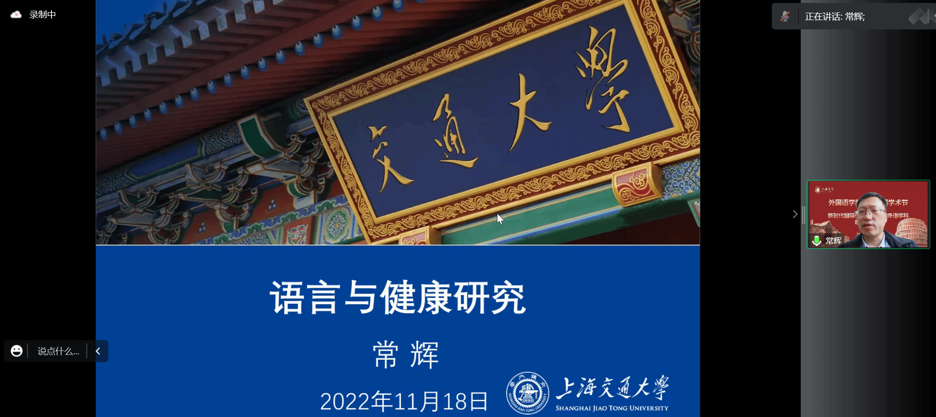 第二位主讲人是上海交通大学Beat365中文官方网站院长常辉教授。他以“语言与健康研究”为题,从人类语言健康所存在的问题、当前领域内的相关研究以及失语症三个方面切入,通过各种数据例证和案例剖析,向大家阐明了语言与健康关联的密切性,以及语言与健康研究在科学研究、人才培养和社会服务等方面的巨大价值。