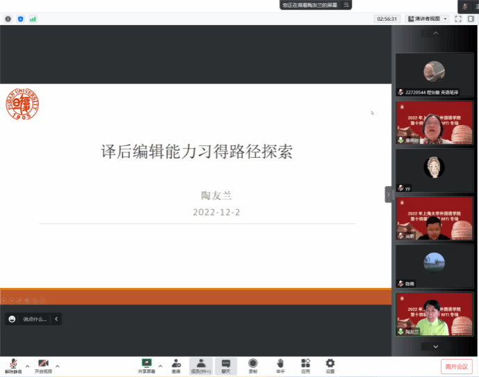 第六位主讲人是复旦大学陶友兰教授。陶教授以“译后编辑能力习得路径探索”为题,以全国机器翻译译后编辑大赛为导引,讲述了机器翻译及其质量评测、译后编辑能力、译后编辑能力与编辑能力的关联、译后编辑能力习得路径相关内容。陶教授指出,机器翻译类型分为:RBMT、EBMT、SMT、NMT,并介绍了人工评测的评测点及方法、机器翻译常见错误类型,还对编辑能力与译后编辑能力的构成、关联和比较相关内容进行了讲解,重点强调了译后编辑研究存在的问题和习得路径。